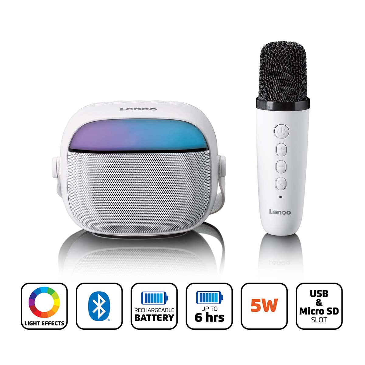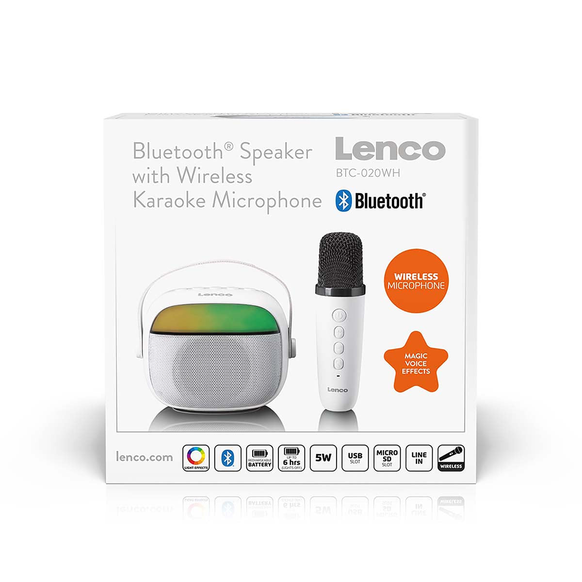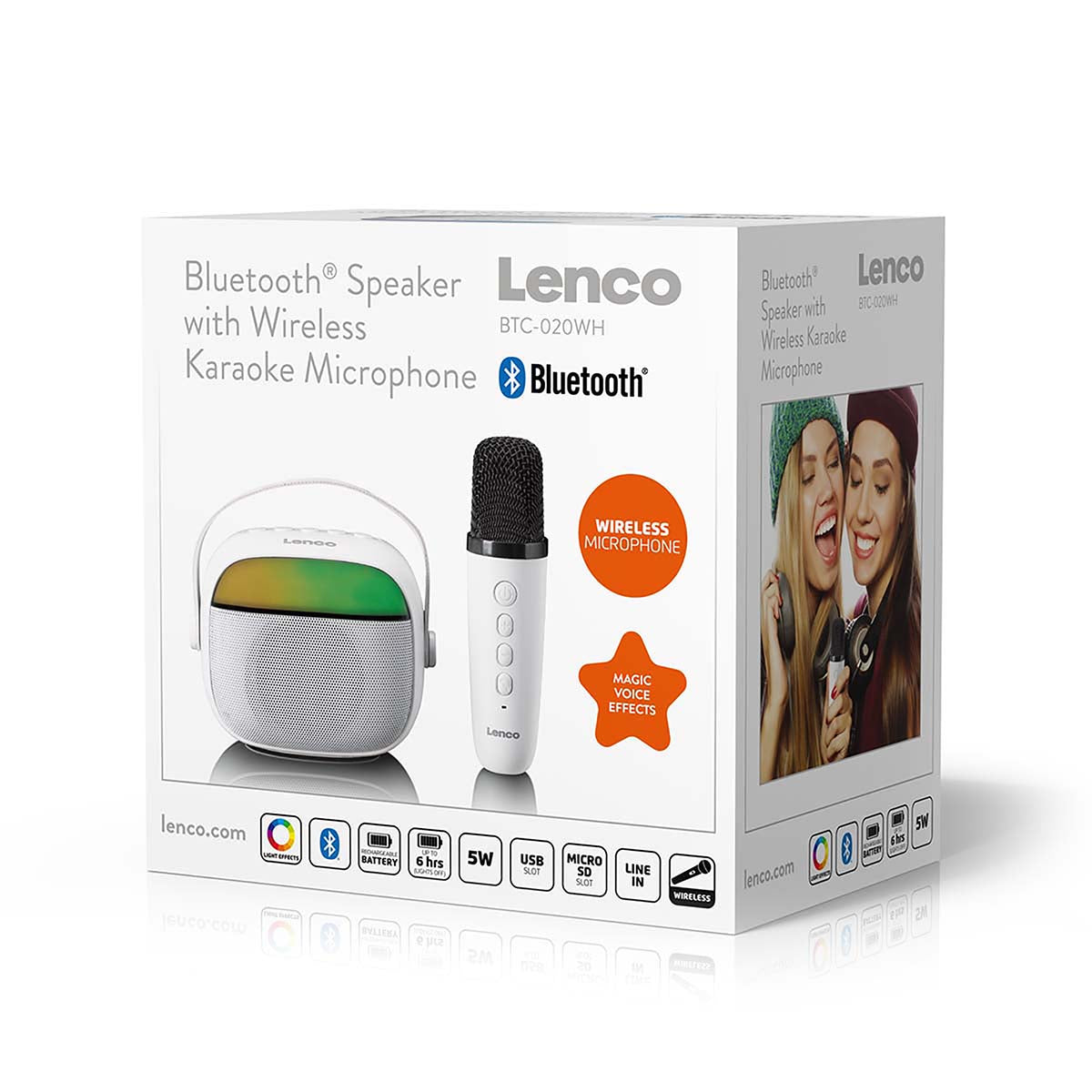 With the Lenco BTC-020WH, you bring a compact and user-friendly karaoke speaker into your home, complete with Bluetooth®, a rechargeable battery, a wireless rechargeable microphone and colourful LED light effects. This small powerhouse is perfect for spontaneous karaoke moments, children’s parties or simply enjoying music together. Thanks to its lightweight and portable design, you can easily take the BTC-020 anywhere. Connect your smartphone, play your favourite song and start singing.
