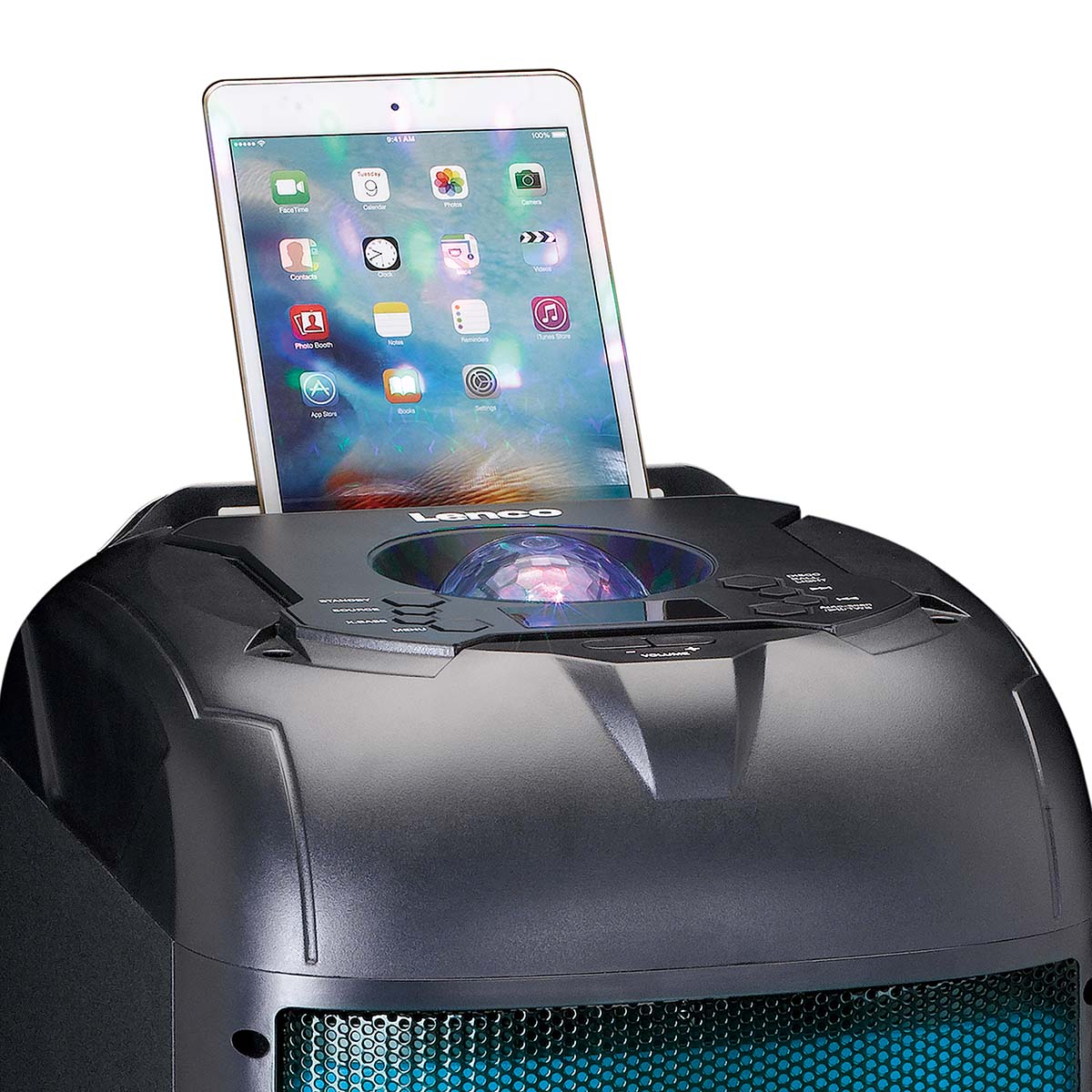 The Lenco PA-260 can also be used wirelessly. Fully charged, you can listen to music up to 12 hours without lighting and up to six hours with lighting!
