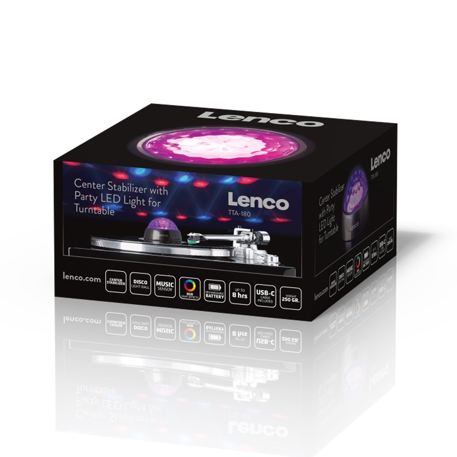 Whether you’re an audiophile seeking perfection in sound reproduction or someone looking to add a touch of extra atmosphere to your record playing, the Lenco TTA-180TN is the perfect record player accessory. The Lenco TTA-180TN is an innovative record stabiliser, also known as a record player weight, that can be easily placed in the centre of the record player's platter. Weighing 250 grams and doubling as a disco ball with RGB light effects, the stabiliser gently presses on the record, ensuring uniform contact with the turntable. This reduces vibrations and keeps the record securely in place, resulting in a more stable rotation. A stable rotation, in turn, contributes to precise and balanced sound reproduction. The unique combination of technical precision and a playful, festive design makes the Lenco TTA-180TN the perfect gift for any record player enthusiast.