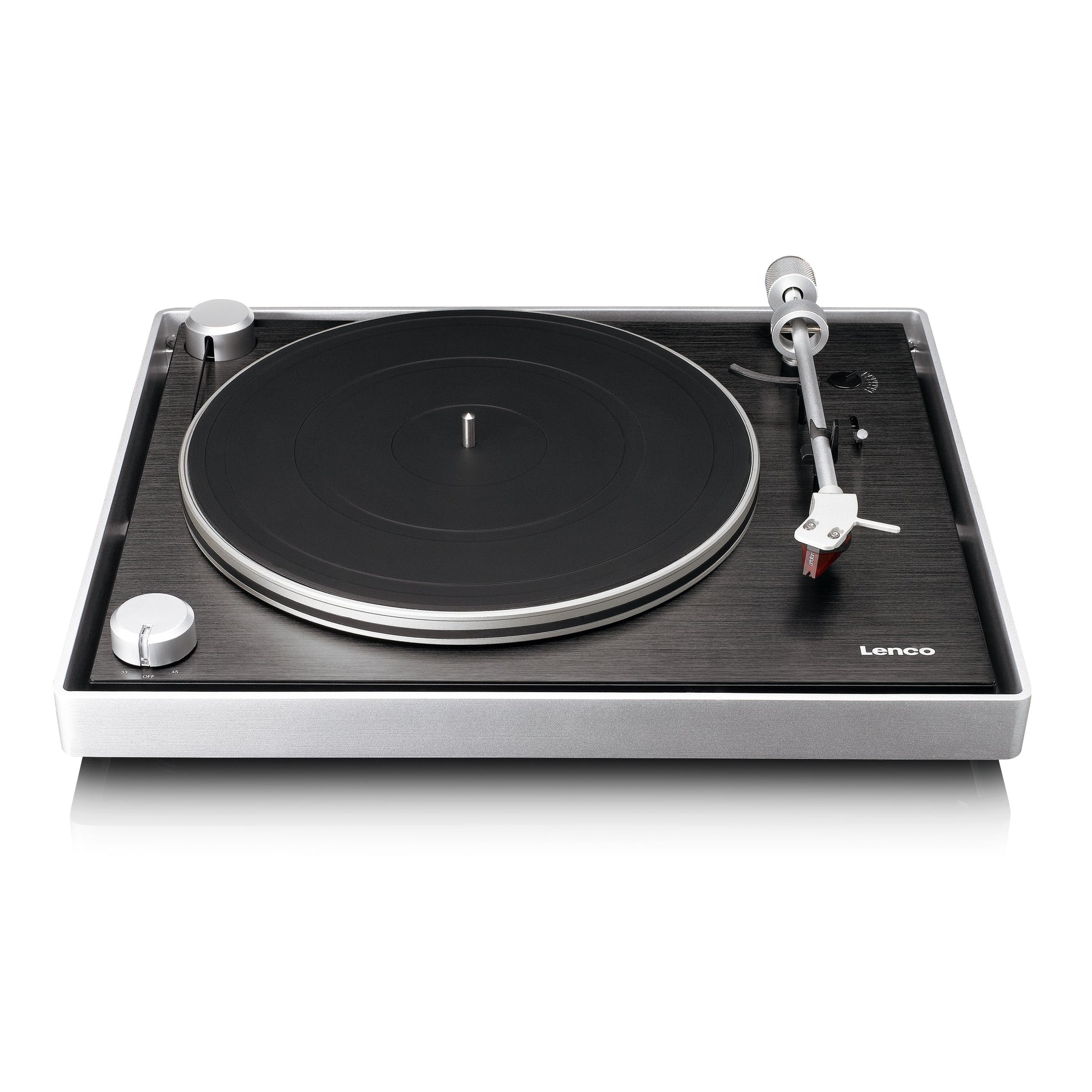 A glance at the Lenco L-455BK immediately reveals the harmonious combination of the sleek black finish and brushed aluminium frame. This high-quality finish lends the record player a luxurious appearance, with the tonearm demanding equal attention. The minimalist tonearm boasts a clean and straightforward design. The refined metal turntable platter further enhances the elegance, perfectly complementing the overall aesthetic. And we haven’t even mentioned the cartridge yet!