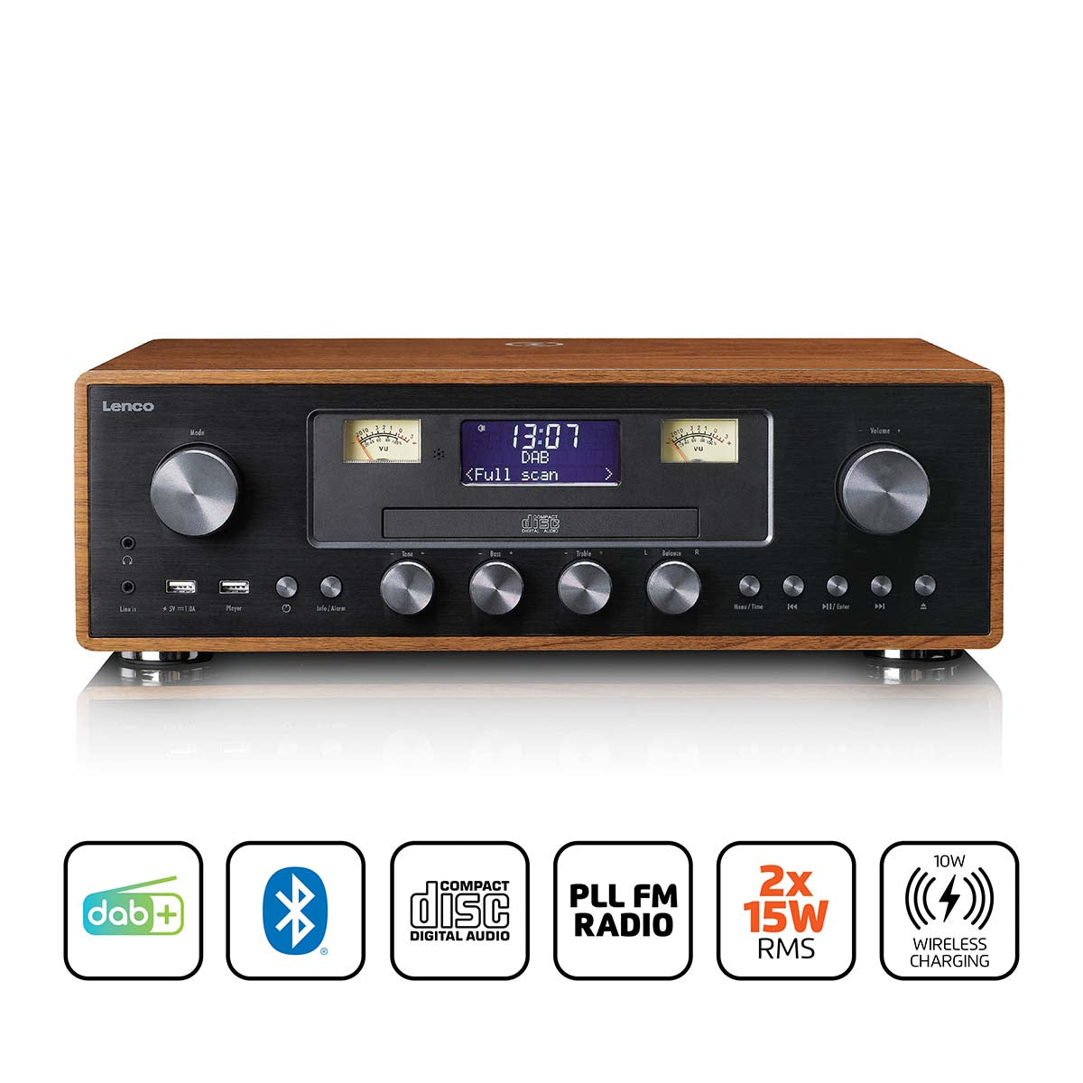 LENCO DAR-081WD - DAB+/FM radio with CD player, USB, Bluetooth and wireless charging point - Wood/Black