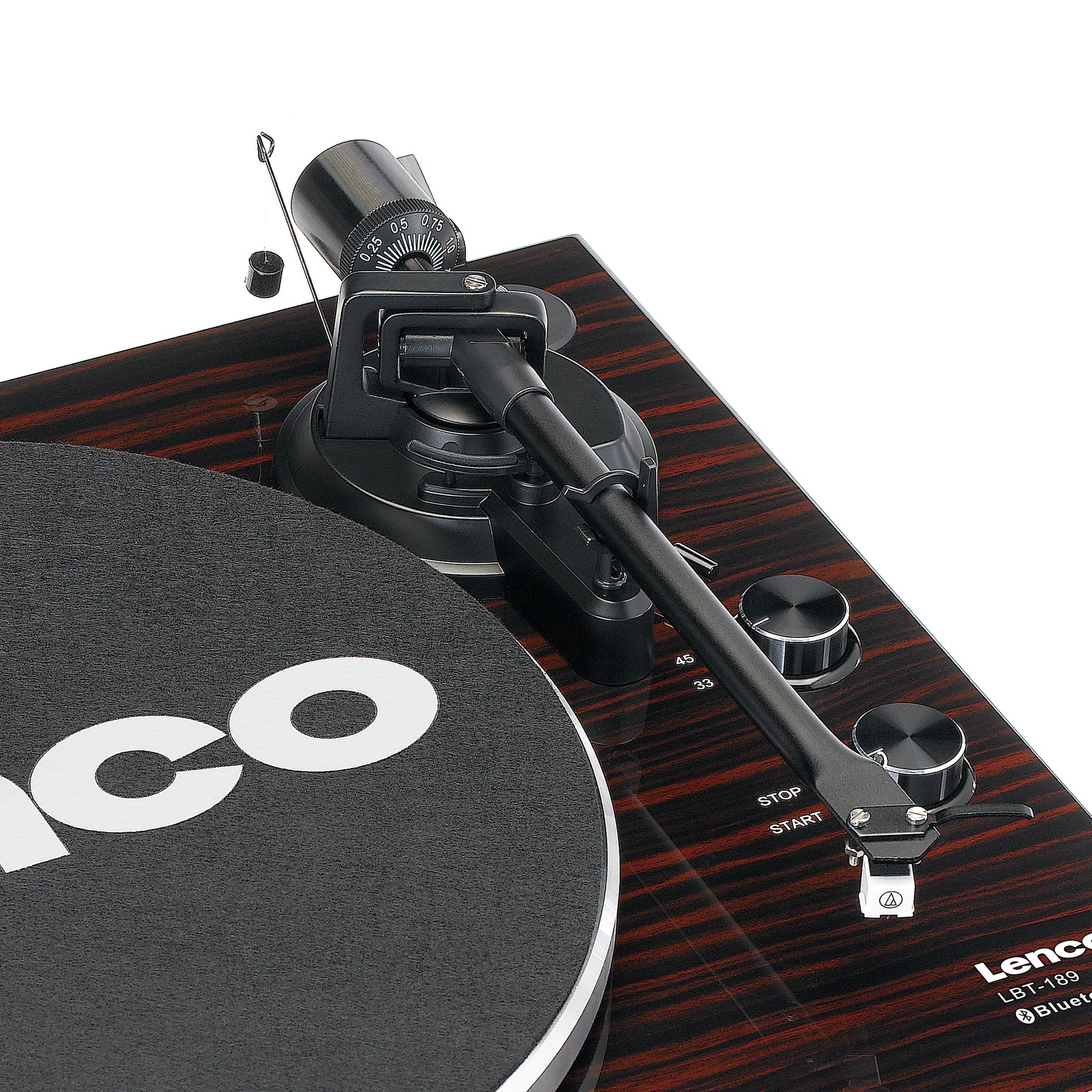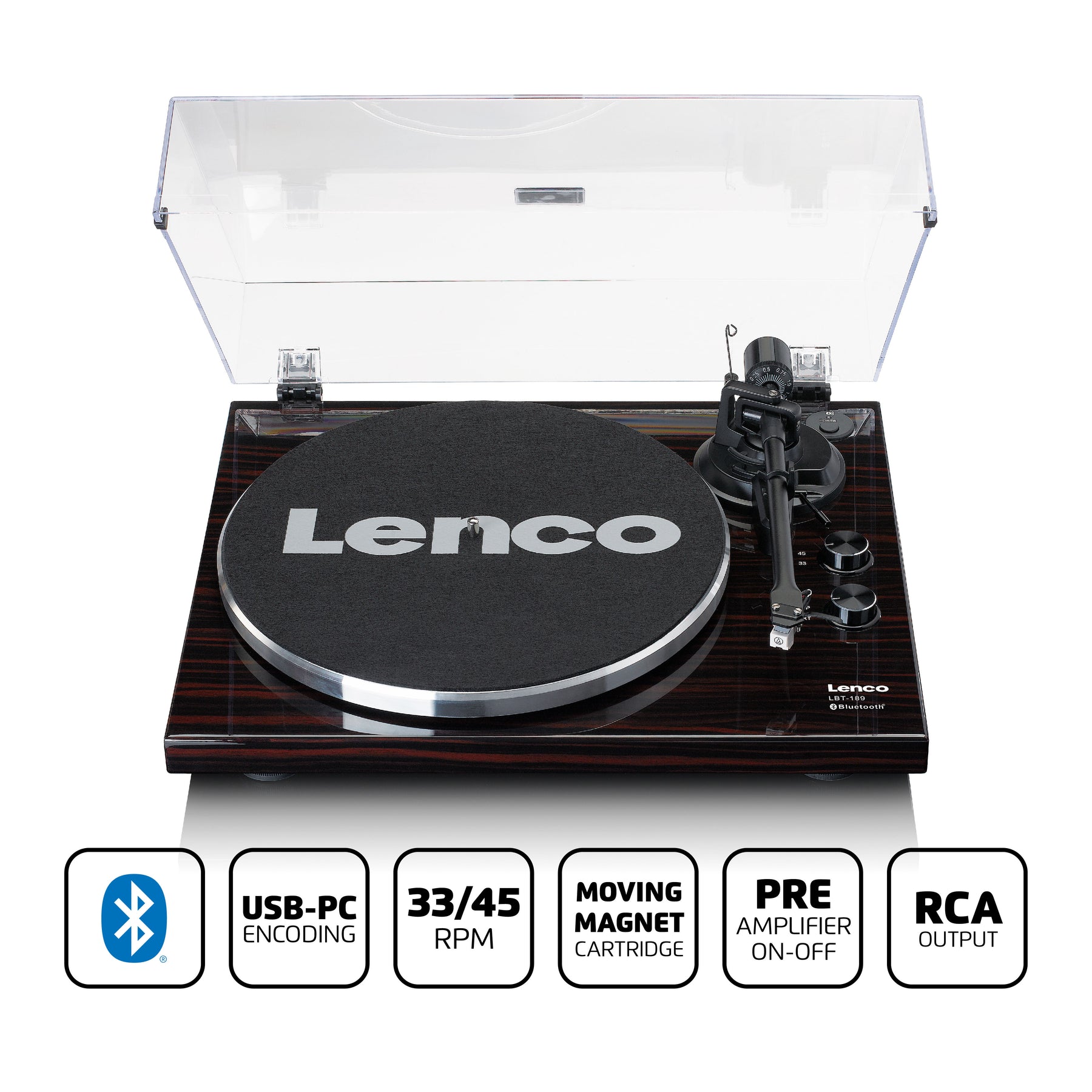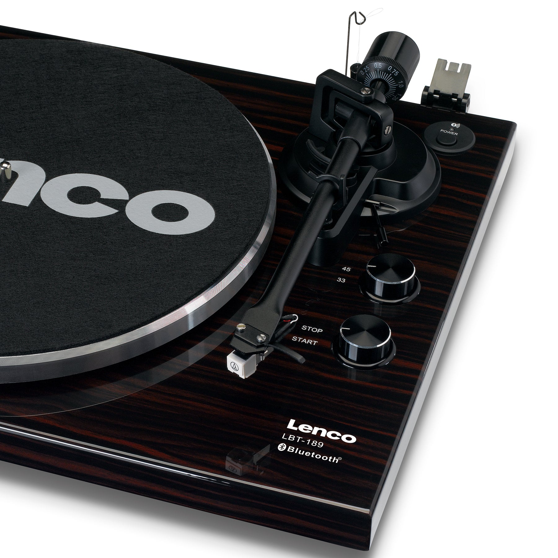 The Lenco LBT-189WA is a record player with Bluetooth® functionality. Connecting this record player to your Bluetooth® speaker or headphones is easy and convenient providing the ideal set-up for enjoying a full warm sound while lounging on your couch at home. Retrieve your old records from the attic and play them on this modern record player. Enjoy the crystal-clear sound of your vinyl, both old and new. Switch from 33 to 45 rpm to play your vinyl record at the right speed.