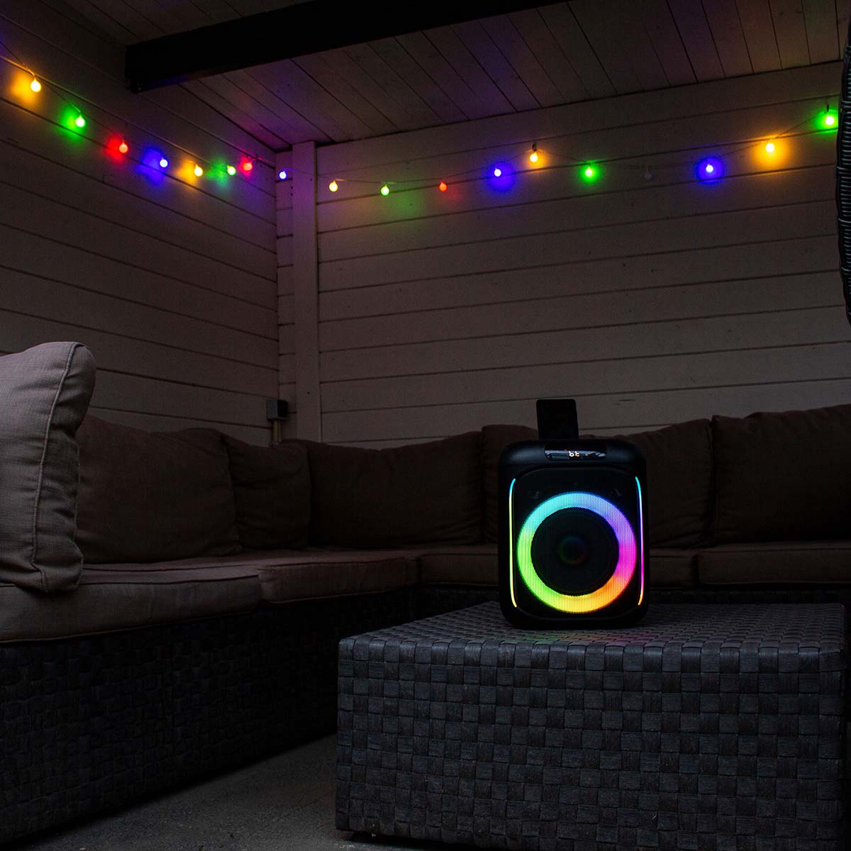 With the PA-101BK, your party is truly complete! Simply connect your smartphone or tablet via Bluetooth® and play music directly from your favourite apps. The front-facing LED lights turn any room into a vibrant disco, while the built-in 2400mAh rechargeable battery offers hours of listening pleasure. With the lights on, you can enjoy up to 8 hours of non-stop music, and without the lights, you can extend this to as much as 14 hours. Make the party unforgettable with the included wireless microphone and invite everyone to sing along!