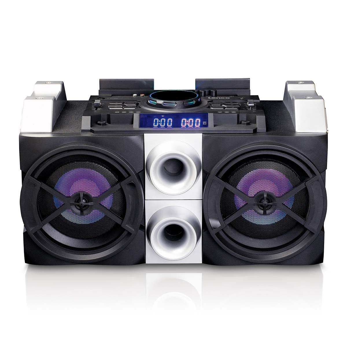 The top panel on the Lenco PMX-150 features a DJ mixing console. Here you can choose various DJ effects and give your tracks that professional touch. At the same time, you can adjust the built-in LED lighting which projects a light show to the sound of your music Your party with the Lenco PMX-150 will make an unforgettable impression.