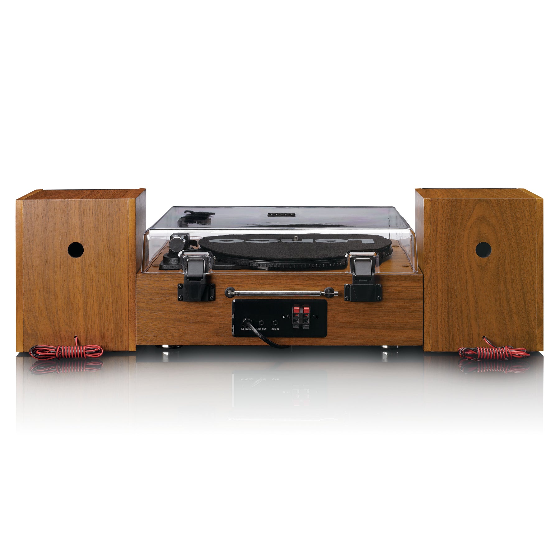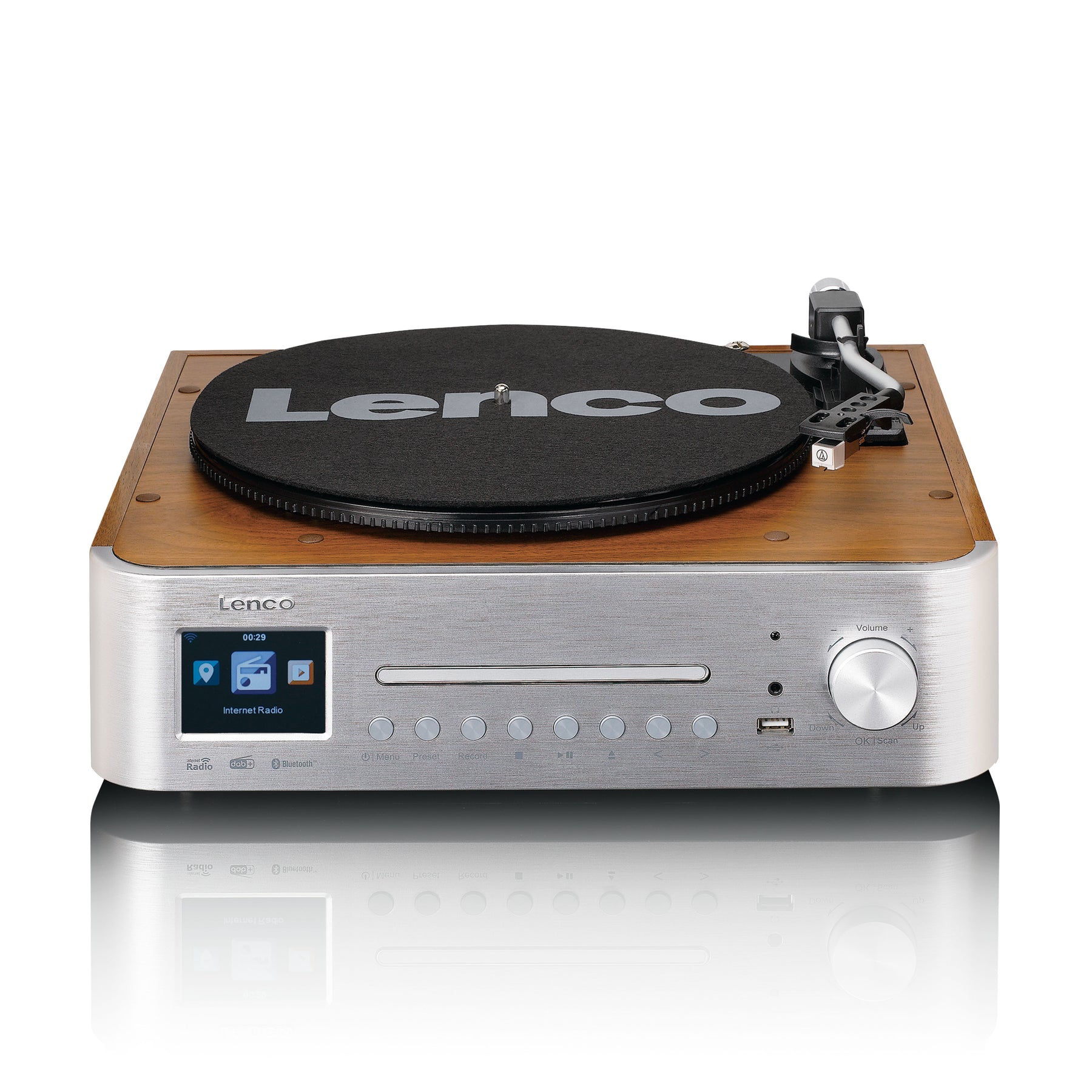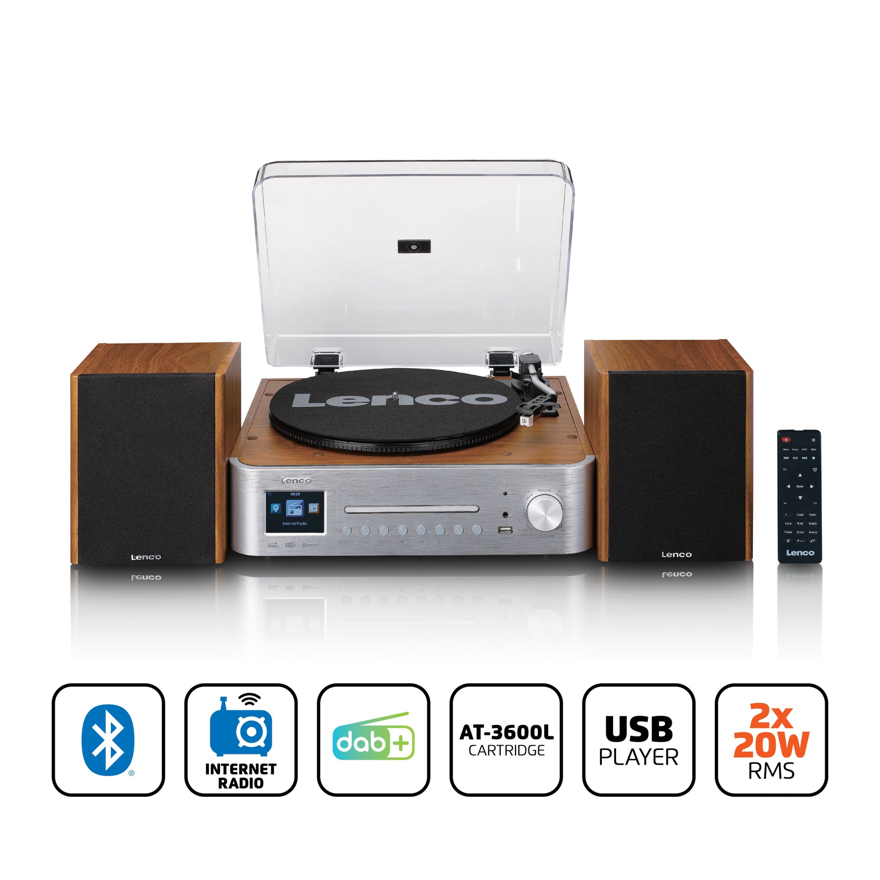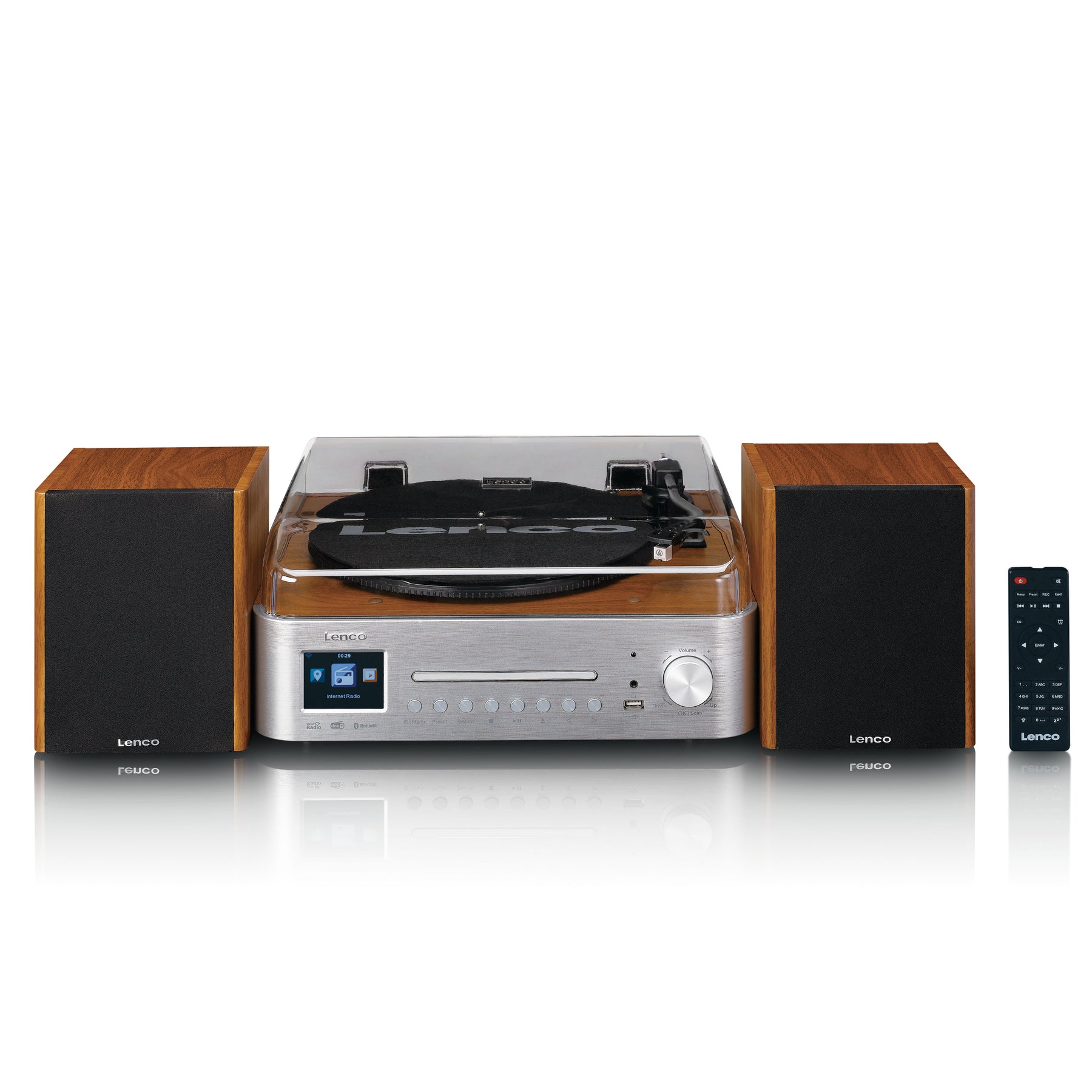 LENCO MC-660WDSI - Hi-Fi system with internet, DAB+, and FM radio, Bluetooth®, CD/MP3 player, and turntable with two external wooden speakers - Silver/Wood