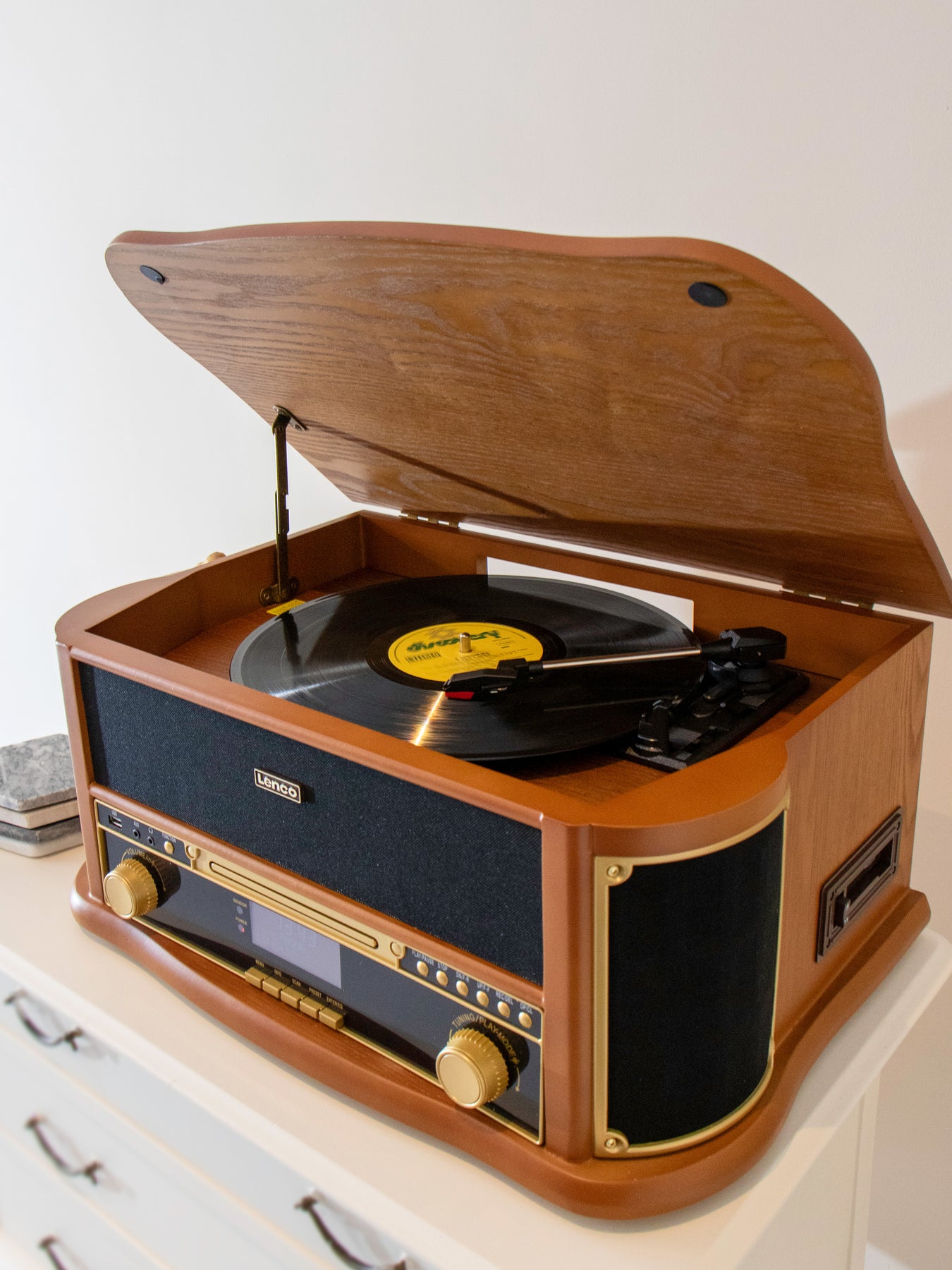 The Classic Phono (by Lenco) TCD-2571WD is an all-in-one multifunctional music system with a stunning retro design that enhances any interior. The TCD-2571WD is characterized by the built-in record player with belt drive but offers so much more. Effortlessly blending classic functionalities with modern playback options, the wooden retro record player features Bluetooth® reception, DAB+/FM radio, a built-in CD player, and a cassette player. This provides a complete listening experience with the perfect balance between the nostalgic charm of vintage aesthetics and modern functionality. The TCD-2571WD has an MDF housing and comes with a remote control for added convenience.
