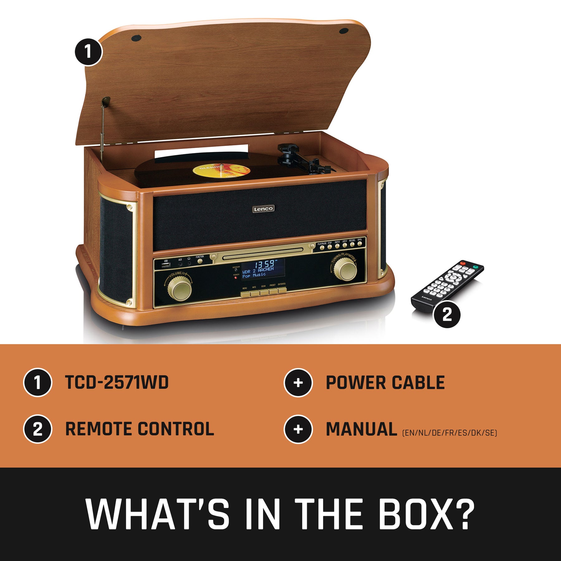 CLASSIC PHONO TCD-2571WD - Wooden retro Record Player with Bluetooth®, DAB+/FM radio, USB encoding, CD player, cassette player, and built-in speakers - Wood