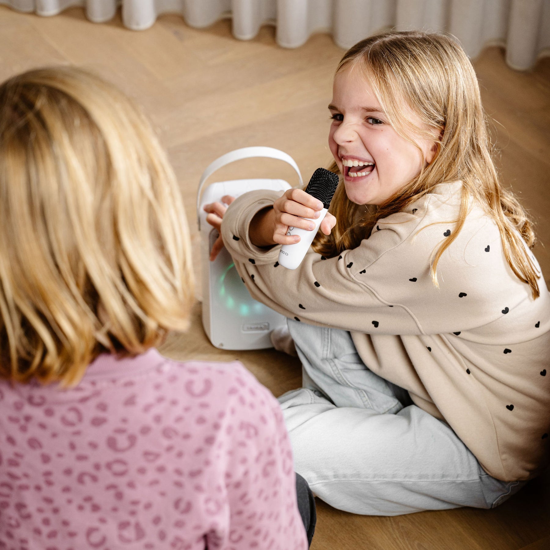 With the Lenco BTC-060WH, you're getting a complete karaoke set equipped with Bluetooth®, rechargeable battery, wireless rechargeable karaoke microphone, disco LED lighting, and a remote control with sound effects and voice changer. We can hardly imagine it, but aren't you a fan of karaoke? The BTC-060WH is still the right choice for you. The karaoke microphone conveniently stores in the Bluetooth speaker. With its portable design and a weight of just 1.42 kg, take the speaker anywhere you go. Enjoy up to 12 hours of uninterrupted fun with the built-in rechargeable 2400mAh battery. With the Lenco BTC-060WH, the party is literally in your hands! Let's get this (karaoke) party started!