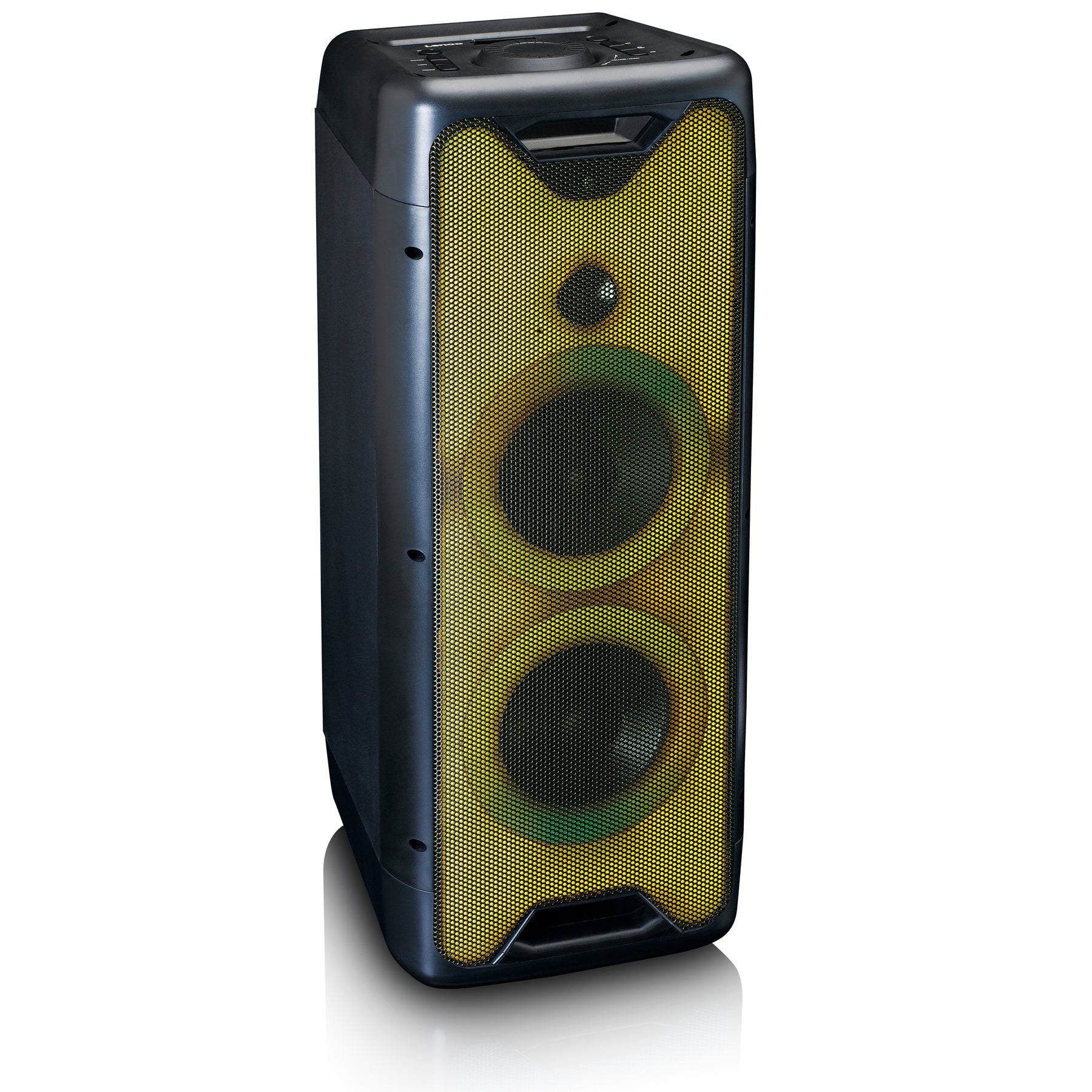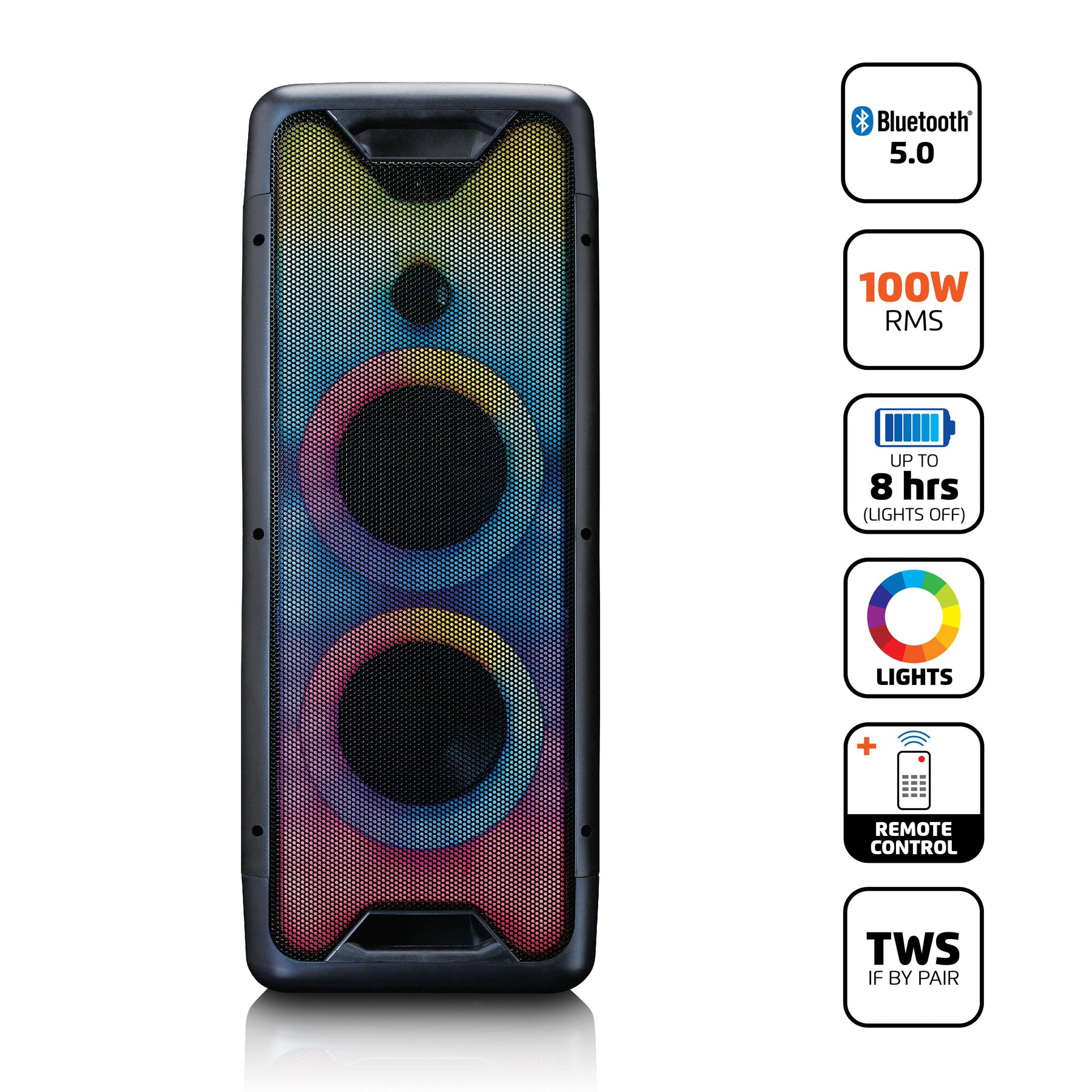 The Lenco PA-200 is a Bluetooth® party speaker with light animation on the front. The powerful class D amplifier with X-drive mode has an output power of 100 Watt RMS. It consists of one horn, a 5" woofer and a 6.5" subwoofer. You connect your smartphone or tablet using Bluetooth® and play the music directly from your favourite app.