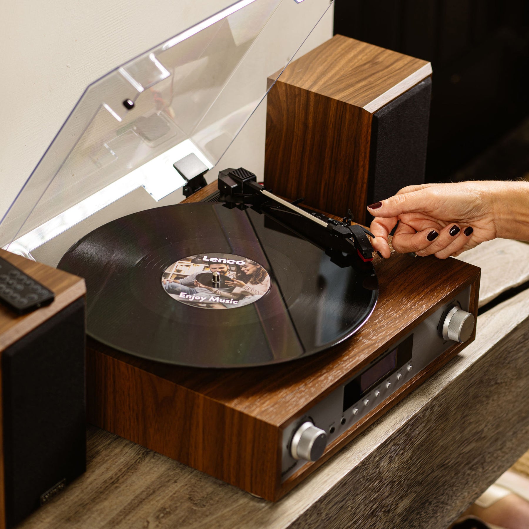 Discover theLenco MC-160WD, the latest model in Lenco's MC series. The MC-160WD is the ultimate HiFi stereo set that fulfills all your musical desires. This beautiful wood-colored set combines the warmth and elegance of vinyl with modern technologies for a unique listening experience. The stereo set comes with two stylish wooden speakers, each delivering powerful sound thanks to its 10 Watt RMS output. The speakers allow the MC-160WD to fill any room with rich and balanced sound, while you control the stereo set easily with the included remote control.Belt-drive record player