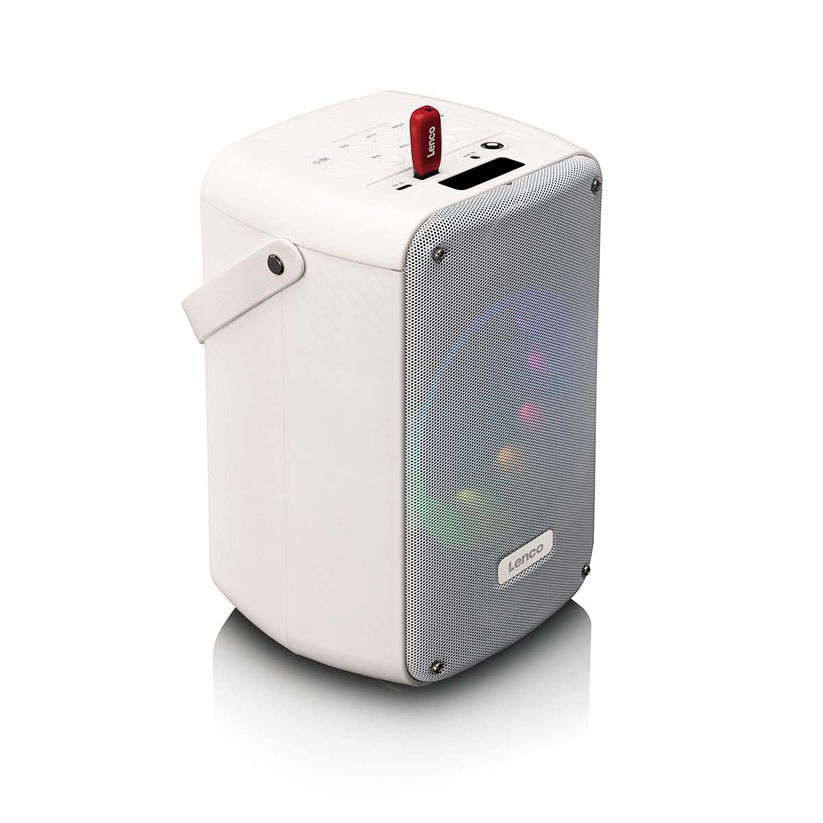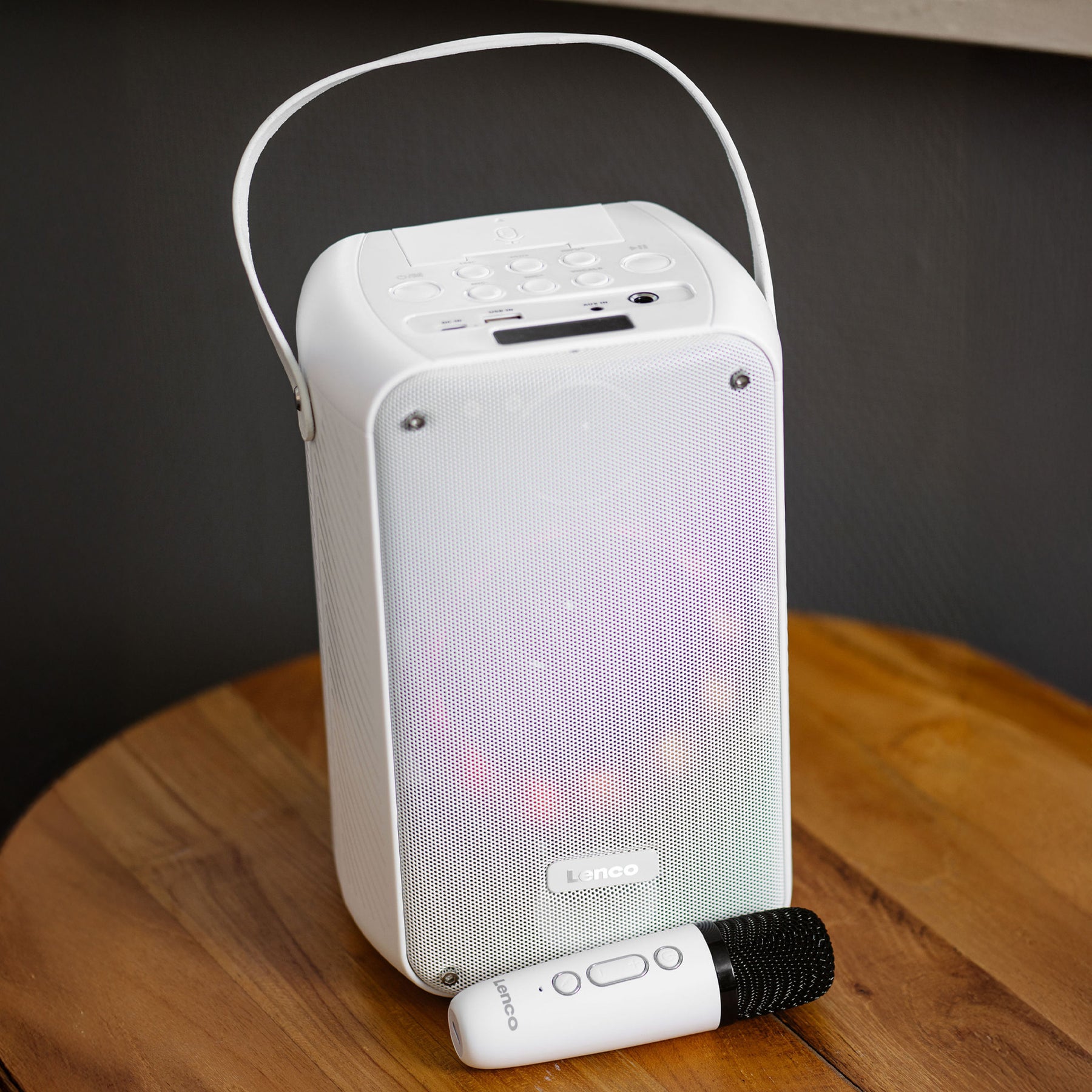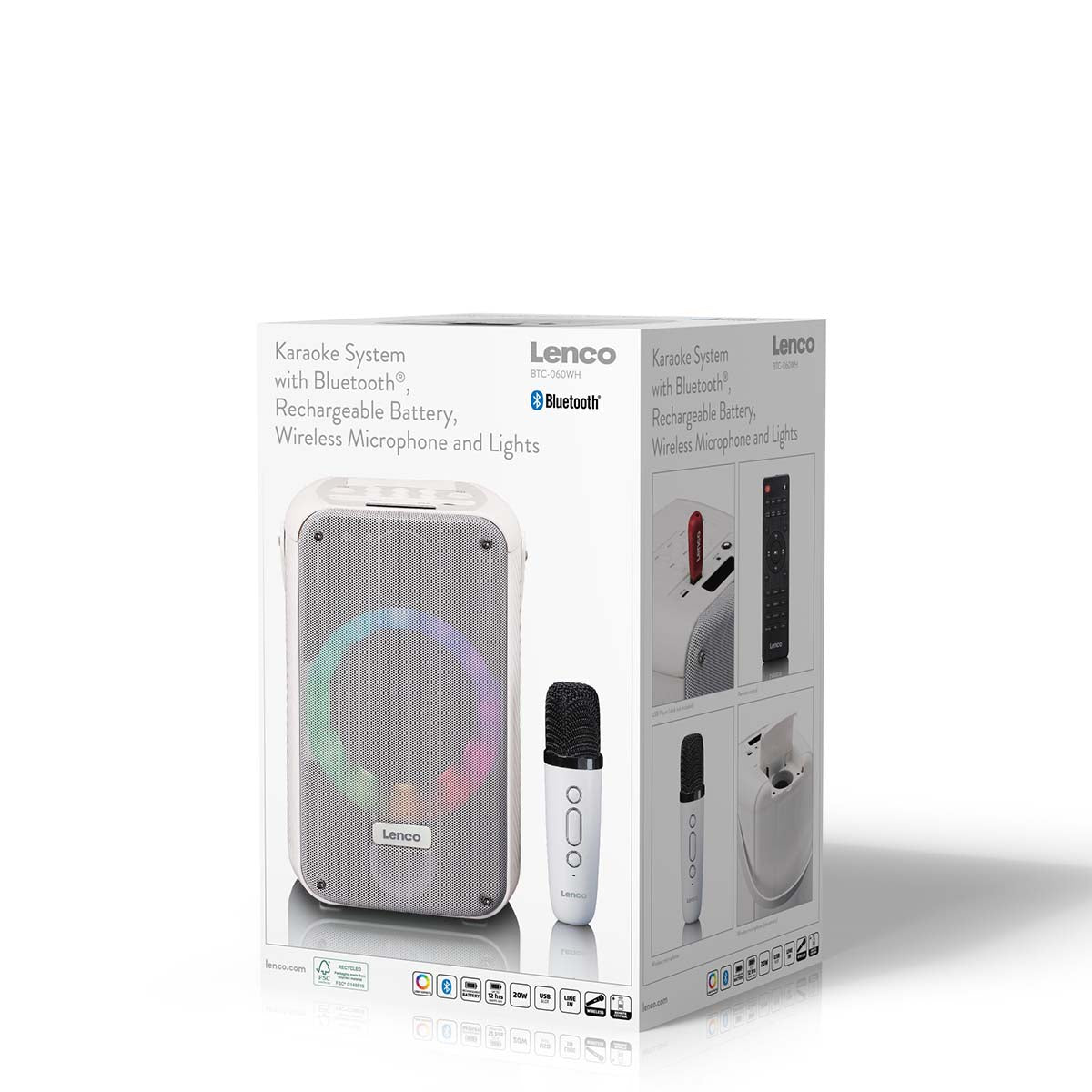 Dzięki Lenco BTC-060WH otrzymujesz kompletny zestaw do karaoke wyposażony w Bluetooth®, akumulator, bezprzewodowy mikrofon do karaoke z możliwością ładowania, oświetlenie dyskotekowe LED oraz pilot z efektami dźwiękowymi i zmieniacz głosu. Trudno nam to sobie wyobrazić, ale czy nie jesteś fanem karaoke? BTC-060WH to nadal właściwy wybór dla Ciebie. Mikrofon do karaoke można wygodnie przechowywać w głośniku Bluetooth. Dzięki przenośnej konstrukcji i wadze zaledwie 1,42 kg możesz zabrać głośnik w dowolne miejsce. Ciesz się nawet 12 godzinami nieprzerwanej zabawy dzięki wbudowanemu akumulatorowi 2400 mAh. Dzięki Lenco BTC-060WH impreza jest dosłownie w Twoich rękach! Rozpocznijmy tę imprezę (karaoke)!