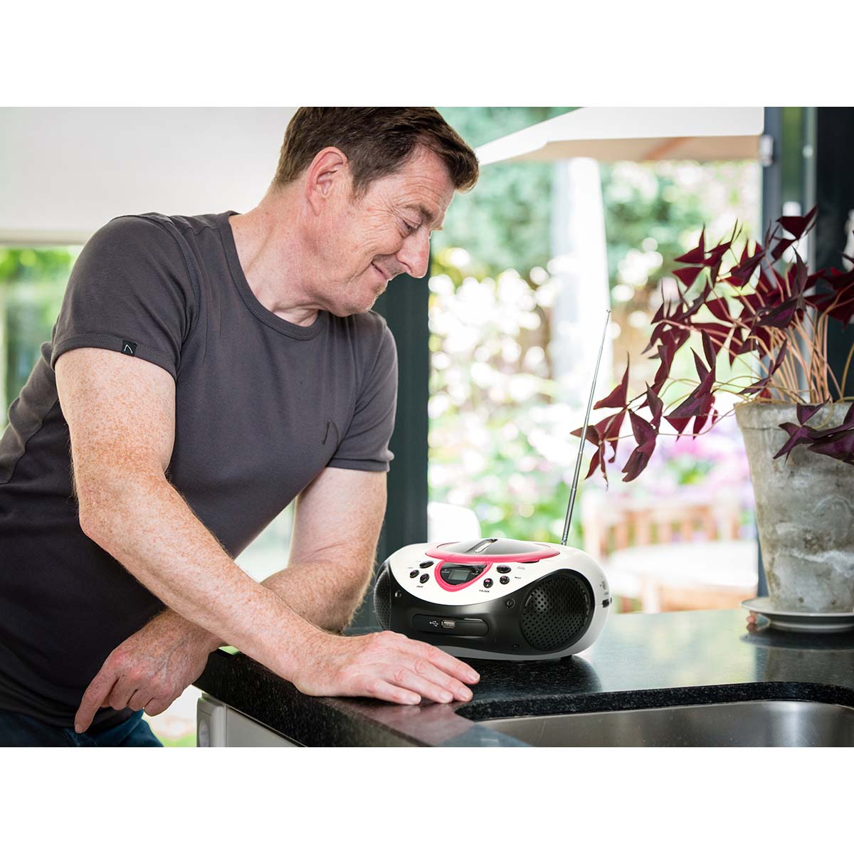 Lenco SCD-38 ma niewielkie rozmiary i jest wyposażony w uchwyt, dzięki czemu jest w pełni przenośny, dzięki czemu można łatwo przenosić radio. Zabierz Lenco SCD-38 ze sobą do parku lub na imprezę ze znajomymi. Wstań i tańcz do muzyki z przenośnego radia i śpiewaj do ulubionych hitów ulubionych artystów.