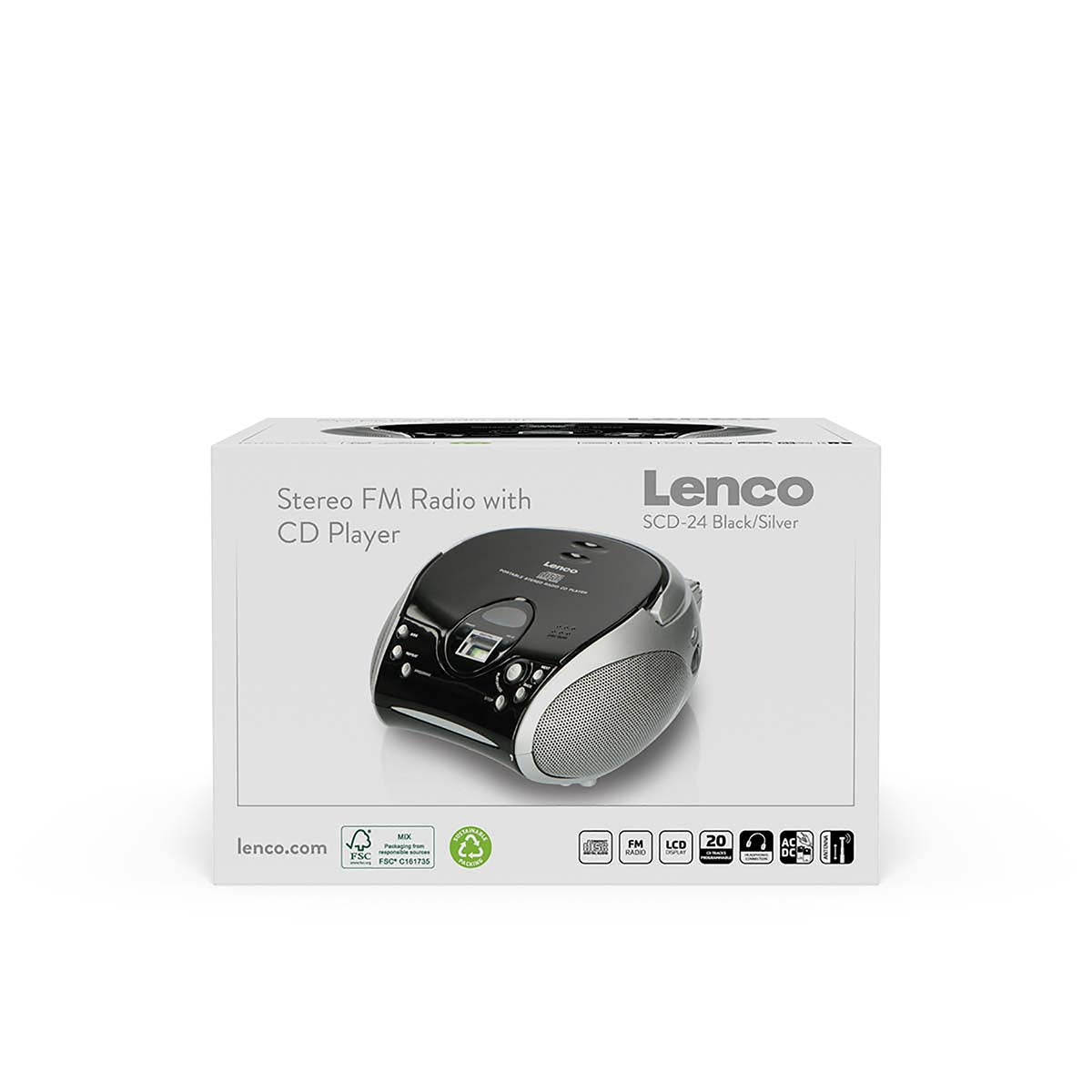Lenco SCD-24 to przenośne radio FM/odtwarzacz CD dla młodych i starszych. Dzięki prostej konstrukcji Lenco SCD-24 jest łatwy w obsłudze. Wystarczy podłączyć Lenco SCD-24 do gniazdka elektrycznego lub źródła zasilania bateryjnego. Za jednym naciśnięciem przycisku możesz od razu cieszyć się słuchaniem ulubionej płyty CD lub stacji radiowej.