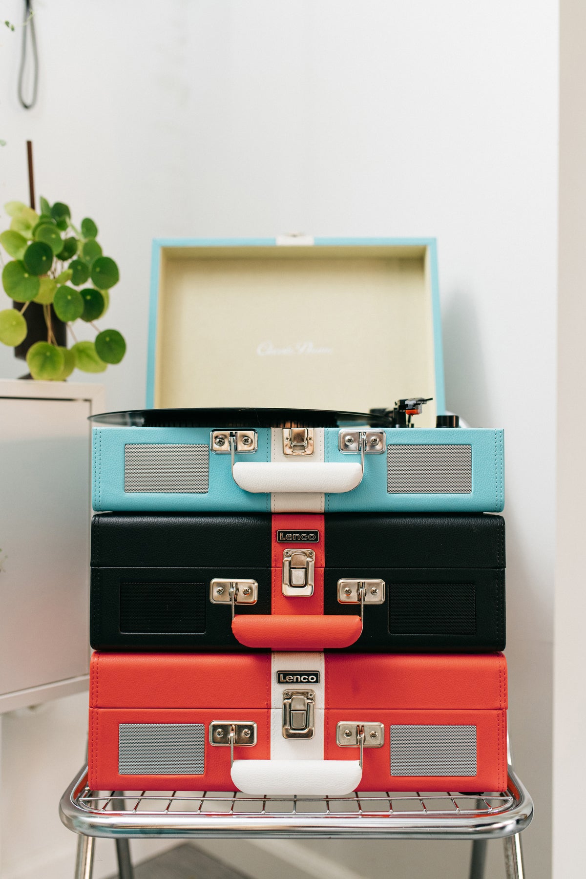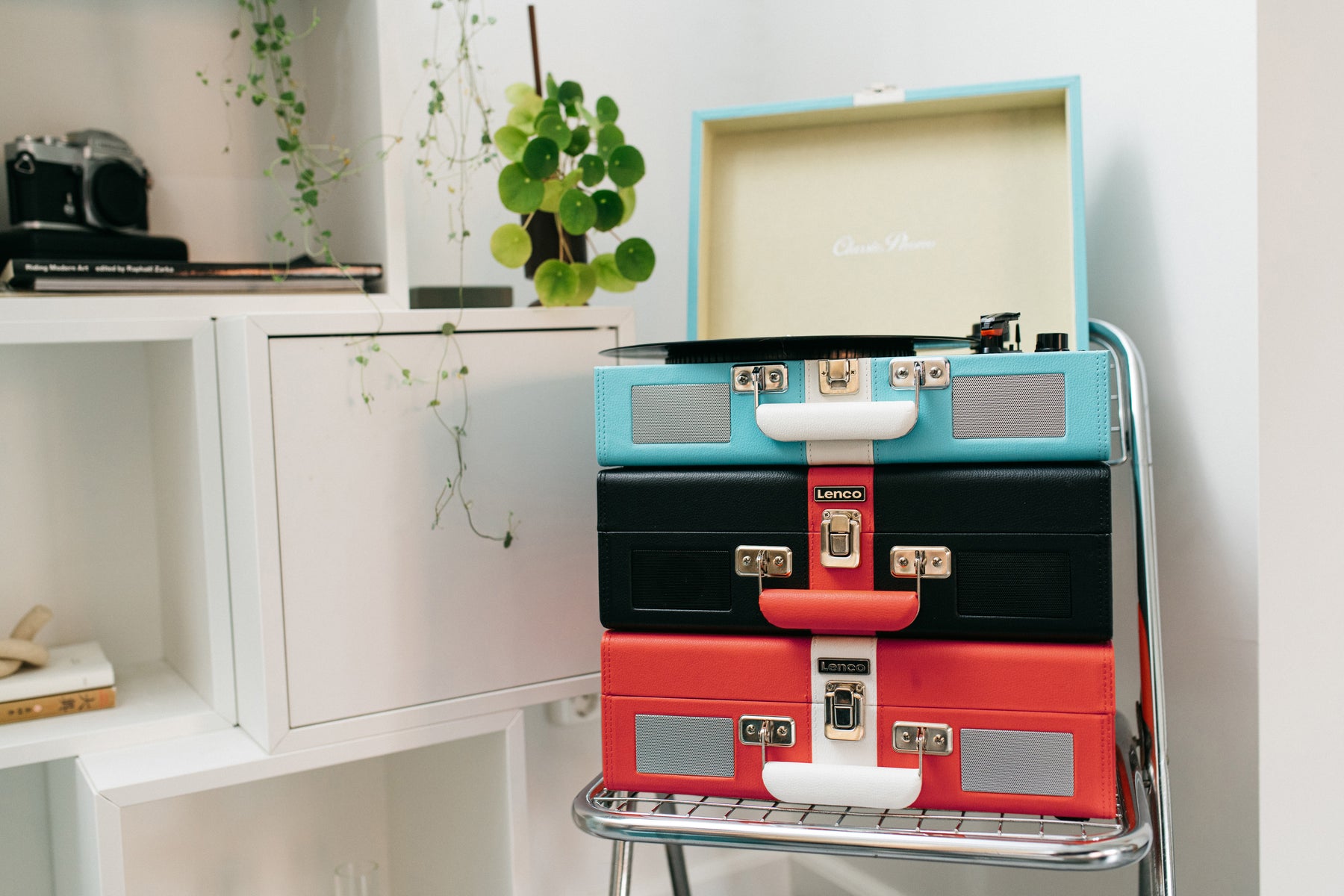 Enjoy the retro design of the Lenco TT-110BUWH. This suitcase record player has modern functions and playback options with a beautiful vintage design.