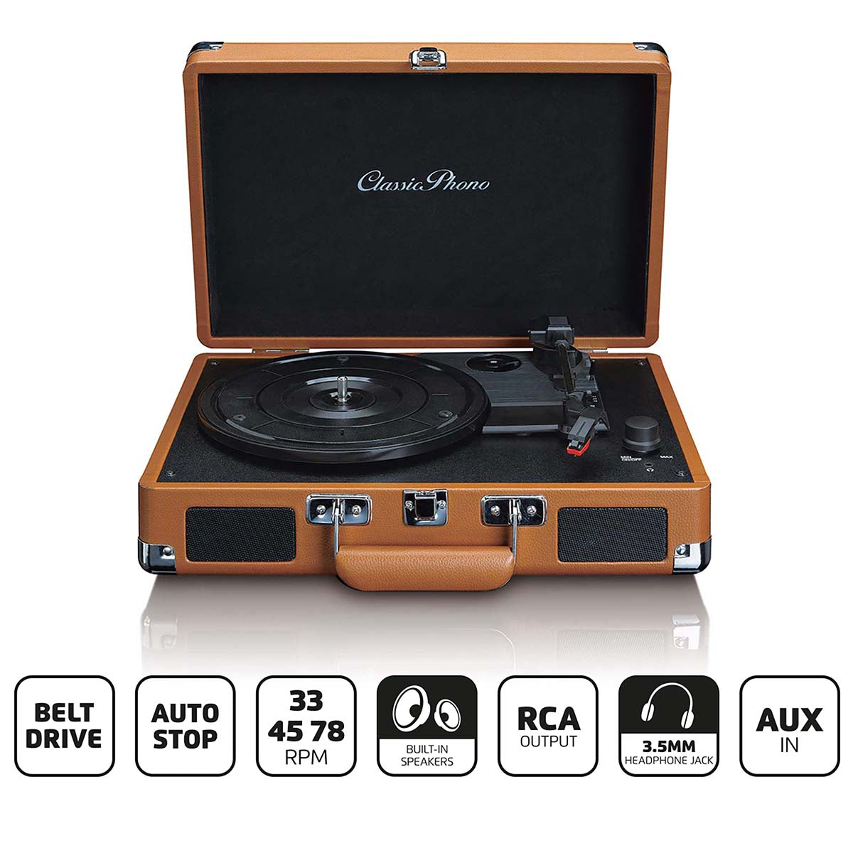 Klasyczny Phono TT-10 jest wyposażony w ceramiczną wkładkę stereo ze zintegrowaną igłą. Możesz odtwarzać swoje płyty z 3 różnymi prędkościami: 33 obr./min, 45 obr./min i 78 obr./min. Gramofon wyposażony jest w napęd paskowy, dwa wbudowane głośniki, wejście AUX, gniazdo RCA, wyjście słuchawkowe oraz wyjście liniowe dla głośników zewnętrznych lub innego sprzętu.