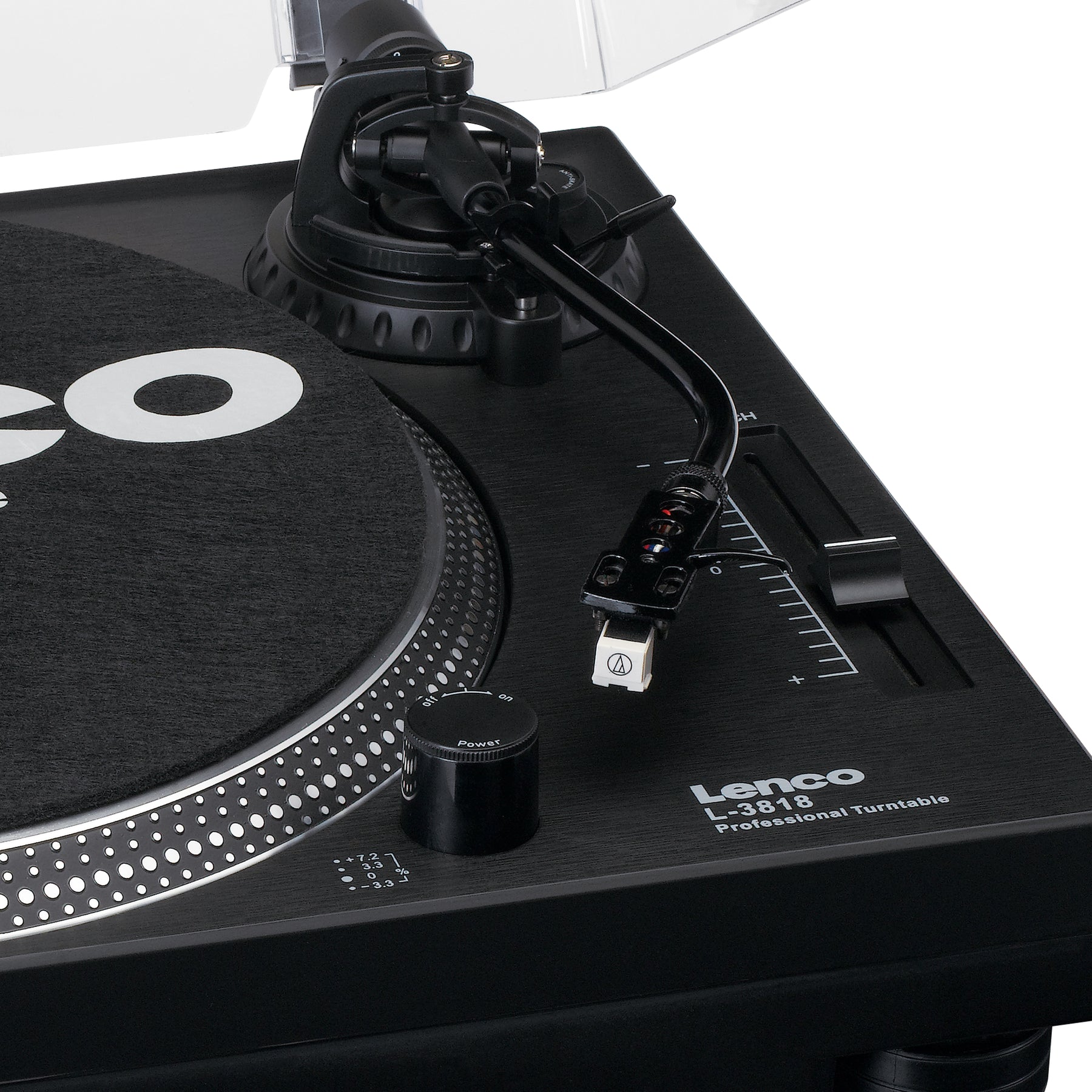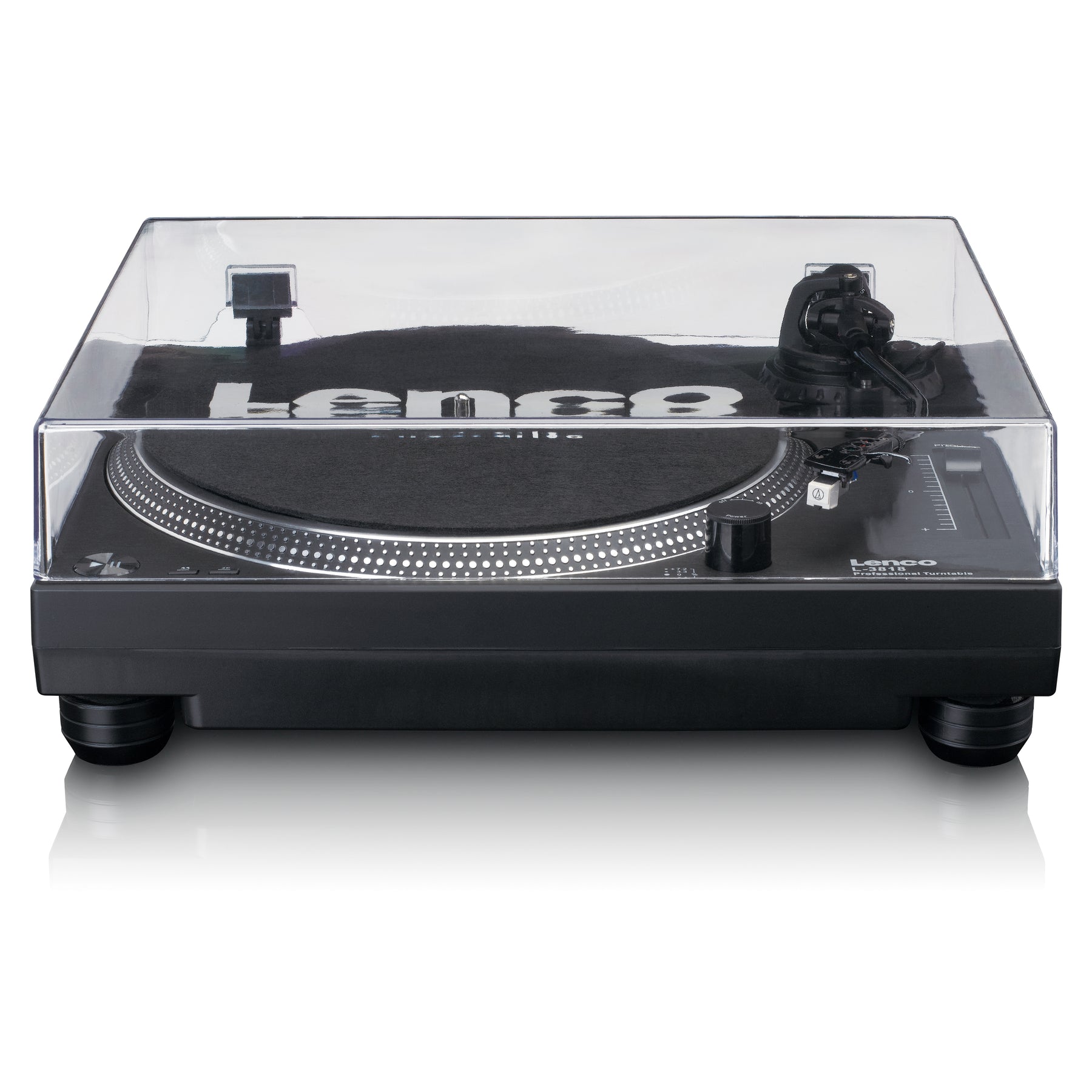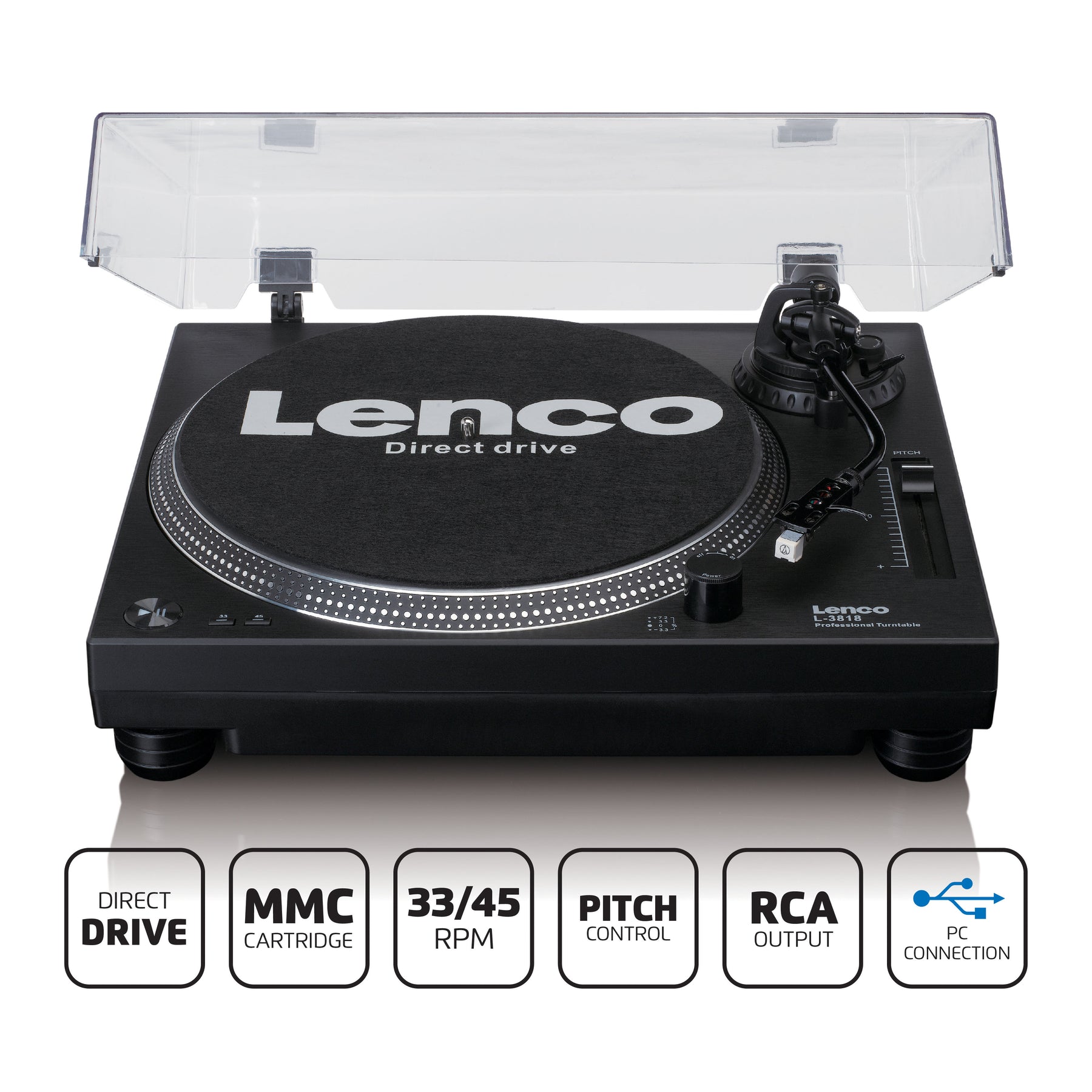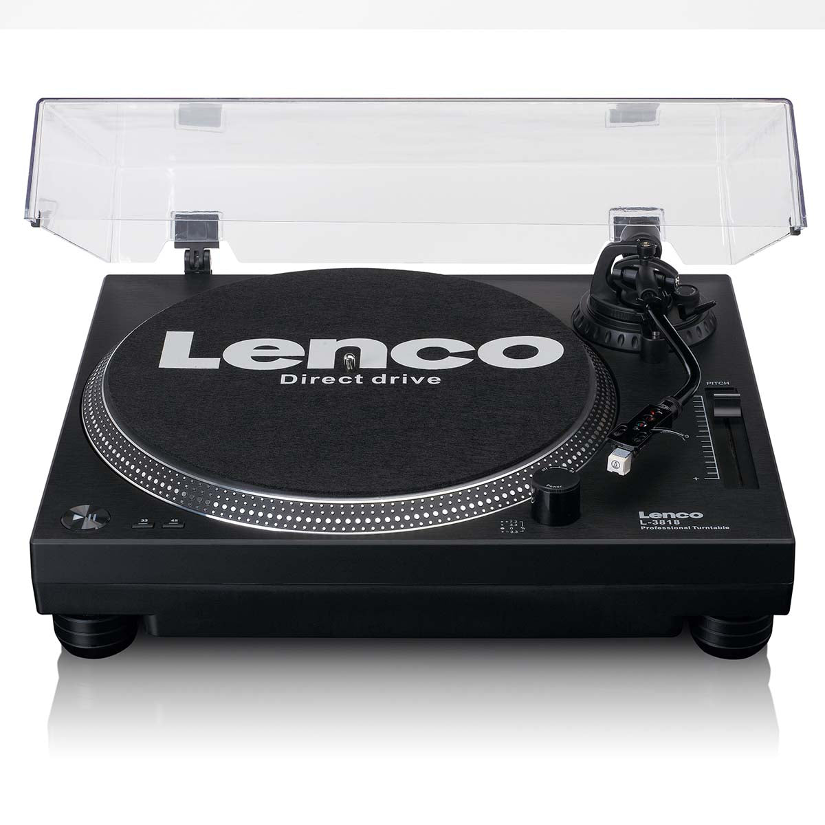 The Lenco L-3818BK is a high-quality, professional direct-drive record player particularly suited for DJs. The direct-drive guarantees that the record starts immediately also called 'quick start' The record player is equipped with lighting for optimal operating convenience and a stroboscope. Easily adjust the speed of your record player with a variable pitch fader. With a built-in phono pre-amplifier, you can connect the Lenco L-3818BK directly to your mixer or stereo.