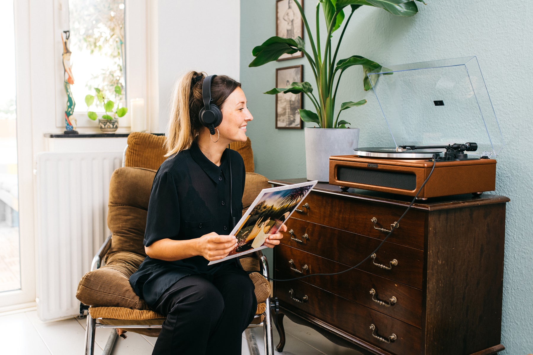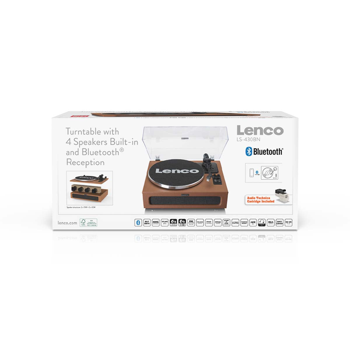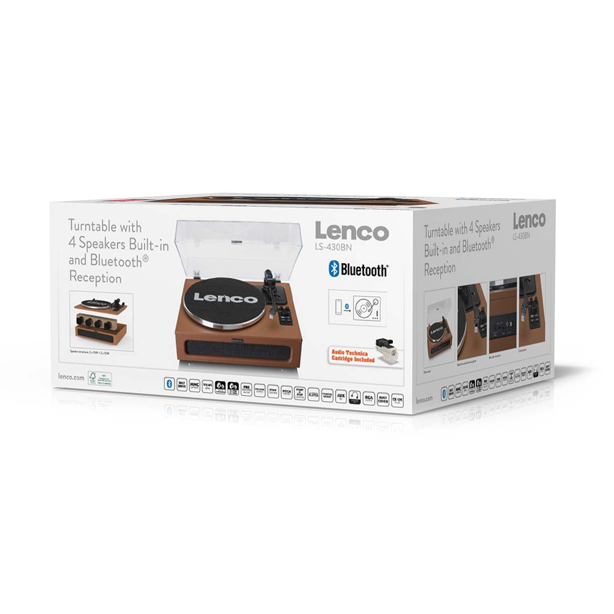 Lenco LS-430 to gramofon z wbudowanymi głośnikami. Cztery głośniki (dwa głośniki o mocy 15 W i dwa głośniki o mocy 10 W) zapewniają ładnie zrównoważony dźwięk. Gramofon jest łatwy w użyciu. Po prostu podłącz go i od razu ciesz się ulubioną płytą LP! Alternatywnie możesz przesyłać strumieniowo swoją listę odtwarzania na smartfonie lub tablecie za pomocą Bluetooth® 5.0, aby połączyć się z głośnikami gramofonu. Jeśli chcesz się zrelaksować i odpocząć przy ulubionej muzyce, po prostu podłącz słuchawki.