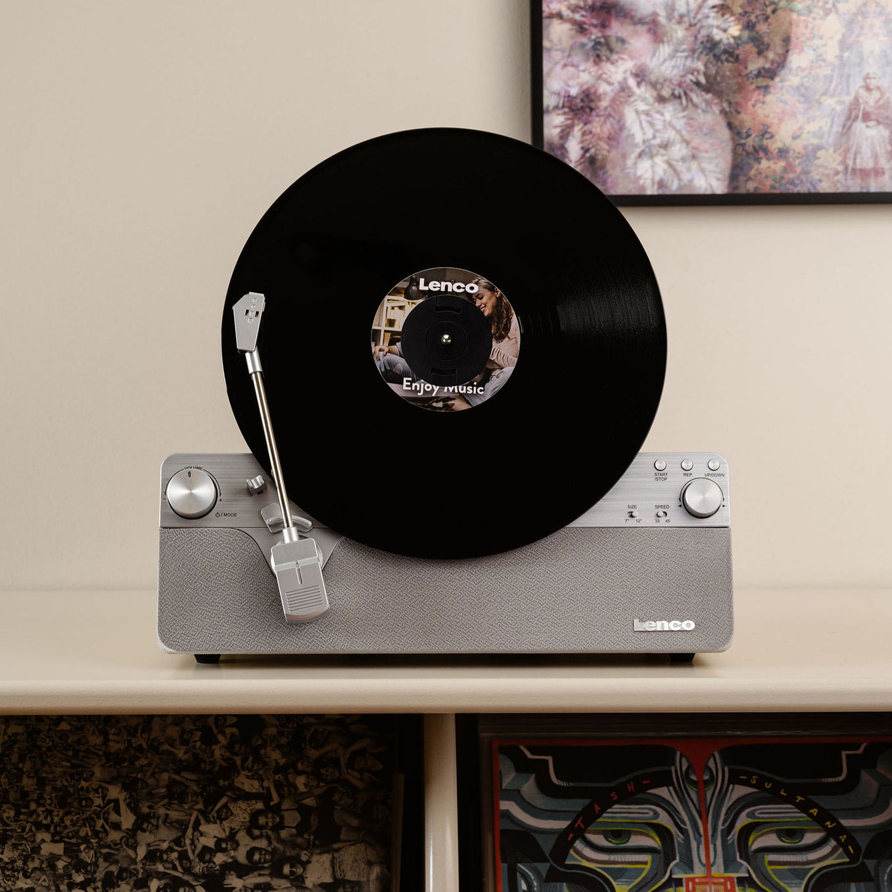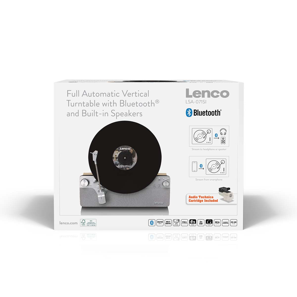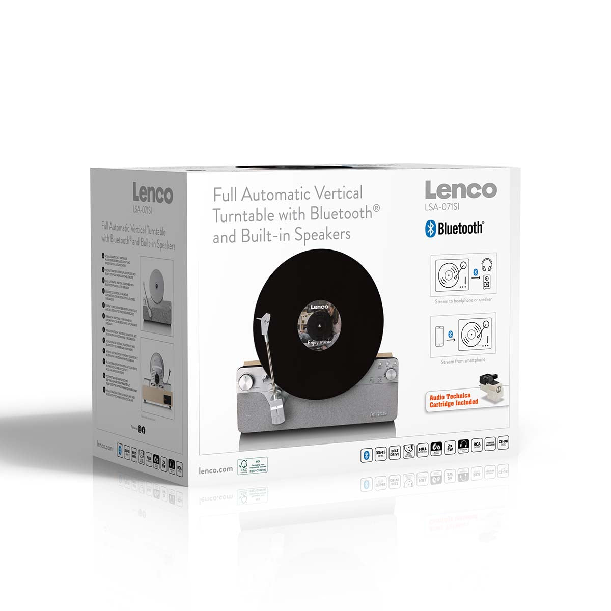 A Lenco record player with an upright design? A dream that no longer needs to stay unfulfilled! With the revolutionary Lenco LSA-071SI, you combine the charm of vinyl with an innovative and aesthetically pleasing design that will amaze any music lover. The Lenco LSA-071SI is a fully automatic vertical record player with built-in speakers and Bluetooth®, designed to deliver a unique listening experience while serving as a stylish addition to your interior. Playing a record in an upright position is a technical challenge, but with the LSA-071SI, it doesn't compromise sound quality! This is thanks to features such as the stable belt drive, integrated stereo amplifier, high-quality Audio-Technica AT-3600L cartridge, and fully automatic functionalities of the record player. Discover how the Lenco LSA-071SI brings your vinyl collection to life vertically and fully automatically!