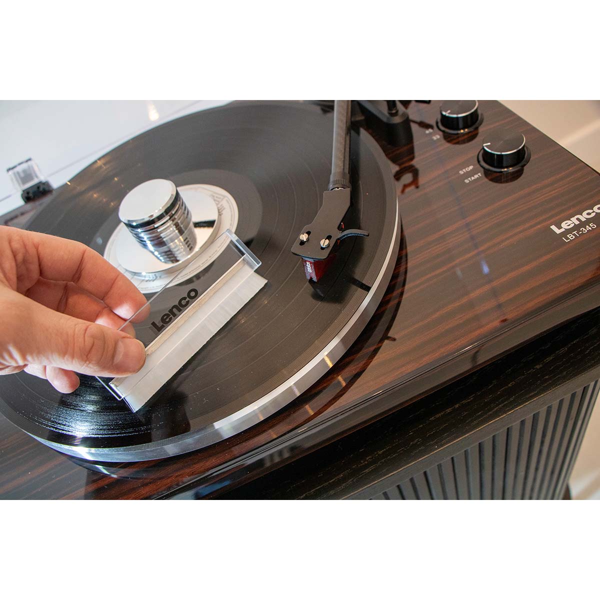 Delikatnie przesuwając szczoteczkę po powierzchni płyty, usuwamy kurz, brud i inne cząstki znajdujące się w rowkach płyty. Dzięki temu uzyskasz mniej szumów tła i wyraźniejszy dźwięk. Dzięki właściwościom antystatycznym szczoteczki do płyt, szczoteczka eliminuje także ładunki elektrostatyczne, ograniczając przyciąganie kurzu nawet po czyszczeniu.