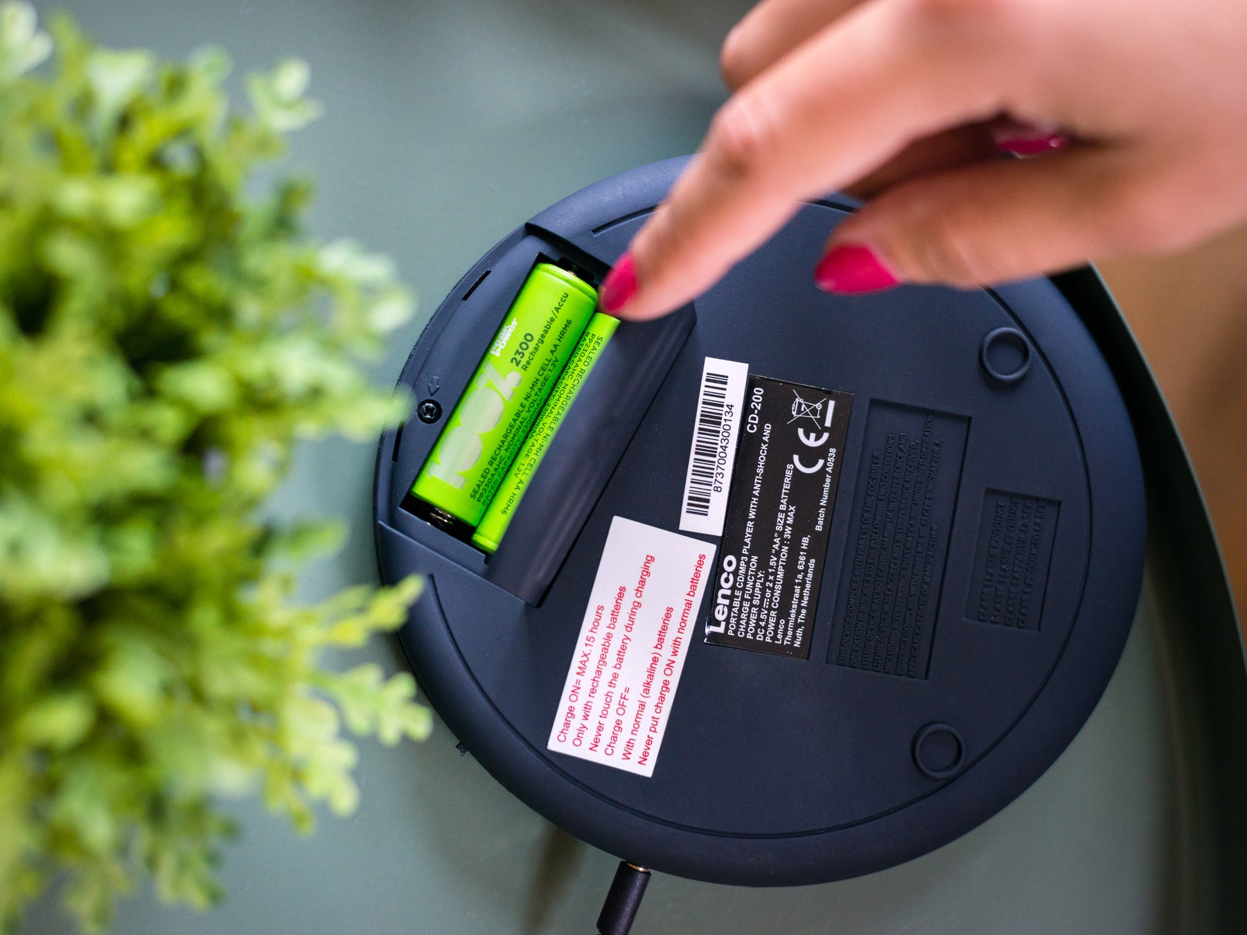 The Lenco CD-200 operates on batteries. The CD player also includes a separate charging circuit for batteries (batteries are not supplied with the unit). If the CD player does not play music for longer than 30 seconds, it switches off automatically too save power. You simply touch a button to reactivate the Lenco CD-200.
